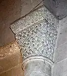 Sur chacune des petites faces de la corbeille on voit un homme sur le dos d'un lion. La face principale et le tailloir du chapiteau foisonnent avec des rinceaux et lianes qui couvrent tout l'espace disponible.