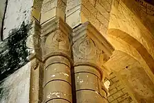 Les chapiteaux du rez-de-chaussée : Parmi les huit chapiteaux, seulement deux sont authentiquement romans : celui au nord, qui est trop dégradé pour être interprété, et le grand chapiteau, à gauche de la porte centrale. Les six autres chapiteaux sont des pastiches du XIXe siècle datant de la restauration de 1860.