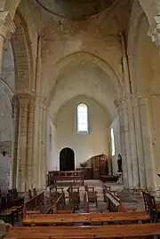 La nef, où l'on descend par six marches, est divisée en deux travées séparées par des colonnes engagées auxquelles sont accolées des colonnes plus basses qui soutiennent des arcs latéraux. Ils prennent appui sur de hautes colonnes à demi engagées dans les maçonneries des murs. Ces colonnes sont flanquées, en parties basses, par des colonnes supportant les arcs formerets visibles à l'extérieur. Chacun des arcs encadre une fenêtre romane, longue et très étroite, sur l'extérieur comme à l'intérieur.