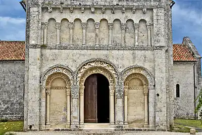 La façade occidentale est caractéristique de l'architecture romane saintongeaise : tripartite au rez-de-chaussée (une porte centrale encadrée de deux fausses portes), surmontée d'une arcature aveugle et terminée en pignon. La façade est encadrée par deux contreforts et divisée en registres horizontaux. Toute la façade est ornée de motifs totalement dénués de symbole de caractère religieux.