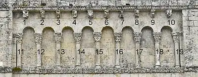 - No 14 : Deux lions, à la tête invertie, les queues sont enlacées. Un modillon identique se trouve sur le chevet de l'église Saint-Trojan de Rétaud. La représentation la plus fréquente de ce style est celle d'un homme nu, accroupi, montrant ses fesses, et avec sa tête retournée de 180°. C'était un symbole du pécheur et de l'homosexualité.