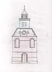 La façade présente trois niveaux d’élévation : le soubassement appareillé, le niveau d’entablement en brique qui est rythmé par deux bandes de pierres d’assise (citées précédemment). Enfin, ce dernier est délimité de la partie précédente par une autre bande de pierre d’assise, le pignon à deux pans. Ce côté de l’édifice est percé d’un portail dont nous ignorons l’aspect primitif (probablement de réalisation similaire au travail des baies), de deux baies plus courtes qu’aujourd’hui, d’un oculus dans le pignon entouré de deux petites baies de forme carrée. Le pignon découvert présente en sa partie supérieure sept ancres de diverses tailles et formes (droites ou en volute) et, en sa base, quatre ancres millésimant le bâtiment, « 1623 ».