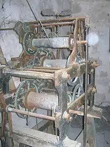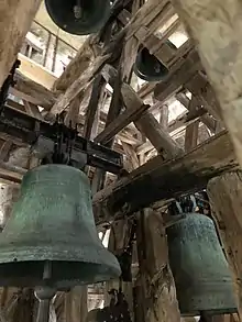 Les quatre autres cloches sont montées dans un important beffroi en partie d'origine (XVIe), formant deux chambres à deux travées. Sonnant à la volée par moteur électrique.