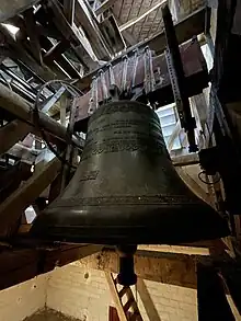 Le bourdon qui est la cloche la plus grave de la sonnerie est nommé Marie-Geneviève-Héloïse-Louise, pèse 3 500 kg et sonne le La de la deuxième octave. Plus petite, l'autre cloche nommée Jeanne-Margueritte-Marie pèse 730 kg et sonne le Fa dièse de la troisième octave[3].