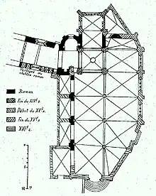 La reprise des travaux a été assez rapide avec le décor et la mouluration des deux travées orientales du bas-côté et de la sacristie attenante dans la seconde moitié du XVe siècle. Le plan de l'église a été diminué. Le clocher prévu à l'ouest a été construit sur la travée du chœur. Le collatéral nord n'a pas été construit. Le mur roman nord de la nef a été percé de fenêtres et d'arcades brisées donnant accès à des chapelles rectangulaires voûtées d'ogives. Le mur goutterot ajouté au sud au début du XVe siècle a été poursuivi en pan coupé pour longer la rue adjacente existante. La nef et le collatéral sud comprennent trois travées voûtées d'ogives à nervures prismatiques qui pénètrent dans trois grosses piles et dans des demi-colonnes placées contre les murs. Ces travaux se sont continués au XVIe siècle. La façade gothique faite en grès houiller de Ferrières s'est désagrégée.