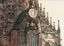 - (de) Cet article est partiellement ou en totalité issu de l’article de Wikipédia en allemand intitulé « Frauenkirche (Nürnberg) » (voir la liste des auteurs).