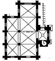 Une sacristie a été ajoutée en 1592 au nord du chœur dans le prolongement du collatéral.