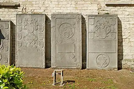 On peut encore apercevoir plusieurs pierres tombales en pierre bleue (petit granit) posées contre la façade sud. Certaines de ces dalles funéraires sont ornées d'un blason central composé d'un écu, d'un heaume, d'un cimier et de lambrequins, et de blasons plus petits disposés latéralement.