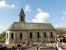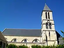 Quant au clocher, il paraît fortement restauré, et la plupart des éléments paraissent avoir été refaits. Il se compose de sa base ; d'un étage intermédiaire ; de l'ancien étage de beffroi ; et de l'étage de beffroi gothique. Des contreforts n'existent qu'au sud des deux premiers niveaux d'élévation. Une corniche sépare ces deux niveaux. Elle est constituée d'écailles à l'est ; d'un tore à l'ouest ; et d'un cordon tressé au sud, qui apparaît également sur les clochers de Nogent-sur-Oise et Saint-Vaast-de-Longmont. Le premier étage est ajouré d'une petite lancette très aigüe, manifestement néo-gothique, qui remplace une baie en plein cintre située plus haut. Une autre corniche marque la fin du premier étage. Elle est composée d'un rang de losanges aux intervalles excavés, motif qui n'existe pas ailleurs dans la région, et d'un rang d'un motif non identifiable à faible relief, et l'ensemble est recouvert d'un larmier. Le second étage est percé de deux baies en plein cintre par face, qui sont cantonnées de deux colonnettes à chapiteaux, et surmontées d'un cordon de billettes, qui fait le tour du clocher au niveau des impostes. Au XIXe siècle, les fenêtres du second étage étaient bouchées. Elles sont maintenant vitrées. L'on sait par Louis Graves que l'agencement de l'étage et les billettes correspondent au parti d'origine, mais la modénature actuelle est fantaisiste, et les billettes romanes ne devaient pas s'accompagner d'un deuxième rang de billettes à faible relief, comme c'est actuellement le cas. Curieusement, ce deuxième étage ne se termine pas par une corniche, mais par un simple larmier. Aucun auteur ancien ne décrit l'étage de beffroi, mais le relevé publié par Eugène Woillez montre à ce niveau un étage masqué, car étant postérieur à l'époque qui l'intéresse. La corniche de têtes de clous se retrouve au sud de la nef, et renvoie à la première période gothique. Chacune des faces de l'étage de beffroi est ajouré de deux baies en tiers-point géminées, dont le trumeau est décoré d'une colonnette au chapiteau ébauché, sans tailloir[10],[5].