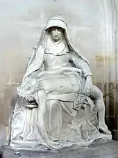 • Le groupe sculpté représentant une Pietà ou Vierge de pitié, en pierre calcaire, mesure 124 cm de hauteur pour 99 cm de largeur, et date de la première moitié du XVIe siècle. La Vierge est assise sur un rocher. Elle porte le corps de son Fils allongé sur ses genoux, et le regarde. Le nez du Christ et le pouce de sa main droite ont été recollés, et le nez et la bouche de la Vierge ont été refaits. Ensuite, l'ensemble a été malencontreusement badigeonné de blanc[15]. On trouve cette statue sur l'autel latéral à droite de l'arc triomphal.