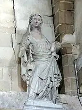 • La statue de la Vierge à l'Enfant, en pierre calcaire, mesure 160 cm de hauteur, et date de la seconde moitié du XIVe siècle. Son revers est seulement ébauché. La partie supérieure du corps de l'Enfant Jésus ainsi que les doigts de la main droite de la Vierge manquent. De la polychromie ancienne, ne restent plus que quelques traces[16]. La statue trône au-dessus du retable de l'autel latéral à droite de l'arc triomphal.