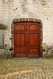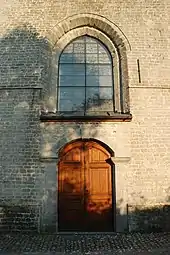 - celle de la face ouest a été remplacée en 1835 par un portail de style néo-classique en pierre bleue[2] dont les piédroits en pierre de taille à impostes de style toscan supportent un arc surbaissé à clé saillante, le tout surmonté d'une grande baie ogivale à double ébrasement ;