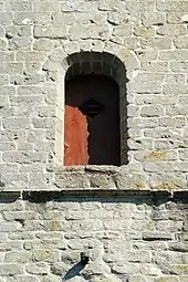 - celle de la face nord de la tour a fait place à une porte de dimensions plus réduites dont l'encadrement de grès ferrugineux à arc surbaissé s'inscrit dans l'ancienne porte en plein cintre ;