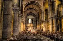 Le style néo-byzantin général combiné avec un clocher néo-gothique, culminant à 56 mètres, est assez rare. Le plan se base sur une croix latine à deux croisillons et, conformément à la tradition romane, avec une large nef de 50 mètres de long et de 12 mètres de haut qui est soutenue par des colonnes sculptées de motifs profanes[8]. On y trouve par exemple un chapiteau dédié à l'industrie, symbolisée par une jeune femme composant une mosaïque et orné de colliers de perles de la Manufacture des émaux. Selon Paul Pigelet : « il n'y manque qu'une chose, mais elle n'était point à la disposition des artistes, c'est le ciel d'Orient »[9].