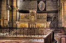 L'intérieur est orné « d'un merveilleux tapis de mosaïque » (Ch. de Fleury)[11] en émaux de Briare dessiné par Eugène Grasset et réalisé par les ouvriers de la Manufacture.
