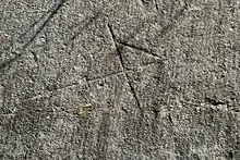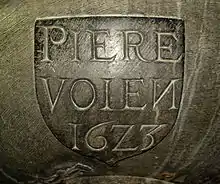 Cet ancien bénitier, qui porte maintenant une statue de la Vierge à l'Enfant, est frappé sur sa cuve d'un écu gravé Piere Voien 1623.