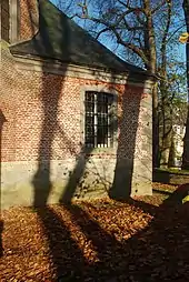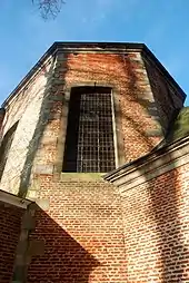 Le chevet est prolongé par une sacristie qui se trouve dans l'axe du chœur et présente les mêmes caractéristiques que l'ensemble de l'édifice : briques rouges, soubassement en blocs de grès et de pierre bleue, chaînages d'angle, fenêtres classiques encadrées de pierre bleue.
