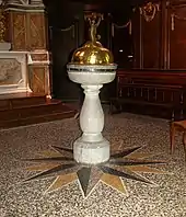 À gauche, au pied de la dernière colonne de la nef avant le chœur se dresse un ancien bénitier en pierre bleue de 112 cm de haut, « de même style que la cuve baptismale, mais mieux dessiné » selon Pilloy-Cortvriendt[P 9].