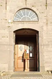 Cette porte s'ouvre sur le vestibule situé sous la tour, dans lequel une statue de la Vierge à l'Enfant accueille fidèles et visiteurs.