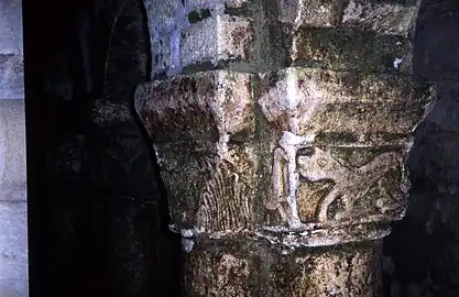 L'avant-corps supérieur de la façade occidentale présente deux pierres de remploi sculptées. Une troisième pierre se trouve sur un contrefort au sud de l'abside, près de la sacristie.
