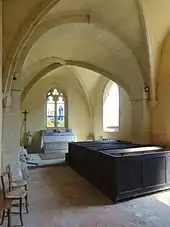 Dans trois angles de la deuxième travée, les ogives retombent directement jusqu'au sol. Dans l'angle nord-ouest, l'ogive est reçue sur un petit cul-de-lampe sculpté d'une tête humaine. Dans la première travée, toutes les ogives sont reçues sur des culs-de-lampe. Ceux du sud affichent des godrons, traités dans le goût de la Renaissance, et ceux du nord, des écussons. Dans l'angle nord-ouest, l'écusson est vierge ; dans l'angle nord-est, il est sculpté d'un croissant porté par deux ailes, et entouré de la devise en latin « Cœlum non soli » (le ciel n'est pas seul), qui, selon Léon Plancouard, un curé du XVIIe siècle aurait fait la sienne. La clé de voûte de la première travée a déjà été signalée ; elle arbore une écusson entouré d'une autre devise et la date de 1605. La clé de voûte de la deuxième travée n'est plus décorée, et les ogives s'y croisent simplement, mais deux quarts-de-cercle pourraient être les vestiges d'un décor sculpté détruit. En contradiction avec la datation de la chapelle du début du XVIIe siècle est la baie du chevet, qui est muni d'un remplage flamboyant. Il se compose de deux lancettes à têtes trilobées, qui sont surmontées d'un trilobe entre deux écoinçons ajourés. Une fois de plus, les commentaires de Léon Plancouard laissent perplexes : la chapelle serait « divisée en deux travées dont les retombées sont dissimulées par des pendentifs romans » (s'agit-il des culs-de-lampe signalés) ; « les piliers de forme cylindrique sont cantonnés d'autres colonnes » ; elle « reçoit la lumière par deux fenêtres dont l'une dans le style du XIIIe siècle ne doit cependant dater que du XVIe ; elle a été à ce moment ouverte pour les besoins de la cause, mais, comme la chapelle elle-même, elle n'est pas de la bonne époque »[27]. Aujourd'hui, il y a trois fenêtres, toutes en arc brisé, dont celles du sud sont dépourvues de remplage.