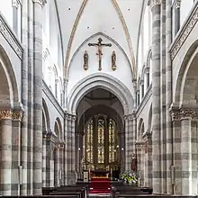 À partir du XIe siècle, le style roman rhénan se développe. Il se caractérise par l'existence d'un chœur à trois absides formant un trèfle, comme dans les églises St. Maria im Kapitol, St. Aposteln et Gross St. Martin à Cologne.