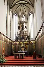 L'église à trois nefs possède sur sa façade deux tours construites selon le modèle de l'église Notre-Dame du Týn située sur la place de la Vieille-Ville. A l'intérieur se trouve une voûte croisée soutenue par deux rangées de colonnes en grès. La longueur de l'église est de 51 m, la hauteur de la nef de 21 m, les tours font 58 m de haut[2].