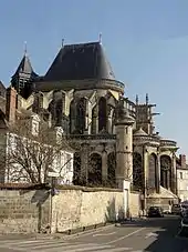 Si le chœur semble entièrement dater du XVIe siècle, il est toutefois à noter que la disposition particulière à l'extérieur du chevet, qui se trouve circonscrit par un mur en hémicycle de 2,50 m de hauteur dissimulant deux petites sacristies entre les chapelles rayonnantes, n'est connue ailleurs que dans l'architecture romane. Il semble donc s'agir d'un héritage du chœur d'origine, qui était sans doute la première partie construite conformément à l'usage qui privilégie le chœur, bien que la période romane était terminée depuis plusieurs décennies lors du début des travaux. Il peut être situé au début du XVIe siècle, et traînant en longueur, la toiture n'aurait été achevée qu'en 1584. Ce semble également être la période du remaniement de la nef et des bas-côtés, et les piliers prismatiques que l'on y rencontre également, ainsi que le réseau flamboyant de certaines fenêtres des chapelles, indiquent bien cette époque[7].