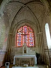 Le chœur a la même hauteur que la nef, mais est moins large, ce qui lui confère des proportions plus élancées. Il s'ouvre, depuis la nef, par un arc triomphal à double rouleau, en arc brisé, dont l'intrados est mouluré d'un méplat entre deux tores, et le rang de claveaux supérieur, d'un tore de chaque côté. Il retombe, de chaque côté, sur les hauts tailloirs carrés d'une colonne engagée et de deux fines colonnettes logées dans des angles rentrants. Leur profil se compose seulement d'une fine tablette et d'un très large cavet. Ce choix d'un profil très simple a apparemment été retenu pour être compatible avec la présence d'un décor sculpté, que le large cavet accueille sur cinq des sept tailloirs au sud du doubleau intermédiaire. Côté nef, le profil des tailloirs se continue latéralement jusqu'aux angles. La sculpture extrêmement fouillée des corbeilles des chapiteaux contraste avec la nudité de la plupart des tailloirs. Elle est caractérisée, selon Dominique Vermand, « par l'ample mouvement de forts tiges se terminant en palmettes ». L'on trouve aussi des feuilles d'eau étagées sur deux rangs, qui peuvent être plates ou s'enrouler aux extrémités, et des feuilles d'acanthe en plusieurs déclinaisons. Au sud, les angles du gros chapiteau sont flanqués de têtes de monstre associées à des jougs. Le chapiteau de l'ogive affiche également une tête de monstre à son angle. Les fûts sont appareillés. Leurs bases sont, pour la plupart, mutilées, mais semblent se composer d'un tore supérieur, d'une large scotie, et d'un épais tore inférieur qui ne déborde presque pas[5].