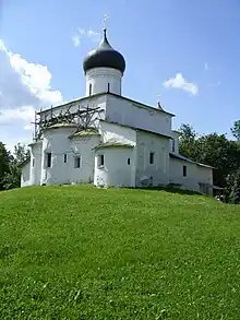 L'église possède trois absides et un escalier d'entrée sous une arcade. Les absides et le tambour de la coupole sont décorés de frises, typiques des ornementations des églises pskoviennes de cette époque. Leurs motifs sont inspirés de ceux de Novgorod avec trois rangées de frises dans le genre moscovite. La nef est rectangulaire et précédée d'une escalier sous arcade. Il y a une abside flanquée de deux petites du côté sud et une du côté nord surmontée d'une tourelle octogonale qui sert d'entrée.