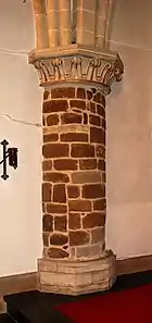 L'appareil alterné blanc et brun du chevet se prolonge partiellement sur les murs des collatéraux avant de céder la place à la maçonnerie du XXe siècle.