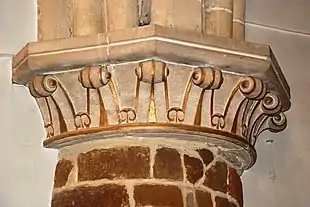 La nef est séparée des collatéraux par de grands arcs ogivaux portés par de fortes colonnes rondes sommées de chapiteaux carrés aux motifs végétaux très stylisés, peints en blanc.
