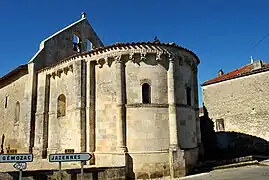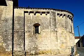 Les trois baies romanes de l'abside, en plein cintre, portent des décorations géométriques. Les deux baies du chœur, plus tardives, sont sans décoration.