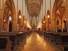 L'église gothique, résolument simple, est à trois nefs sans transept et mesure 73 mètres de longueur et 25 mètres de largeur. Elle ne possède pas de haut clocher, étant une église d'ordre mendiant, mais une petite tourelle. La nef a six travées. Le chœur principal, à quatre travées dépassant à l'orient, est flanqué des deux côtés par des absides de trois travées chacune. Le vaisseau est conçu avec des voûtes nervurées. Un jubé existant à l'origine a été supprimé, de sorte qu'aujourd'hui la vue s'étend du portail au chœur principal. Le maître-autel et la chaire ont été créés au cours de la rénovation néogothique de 1869. On trouve au nord un deuxième portail avec une rosace. Les chapiteaux sont habilement décorés l'un d'eux du côté oriental montre un petit moine agenouillé vêtu de son habit dominicain avec un compas, sa règle et l'inscription « Frère Diemar »[1] ; il s'agit du maître d'œuvre de l'église. Plusieurs figures animalières datant de 1280 environ se trouvent sur le contrefort oriental[2].