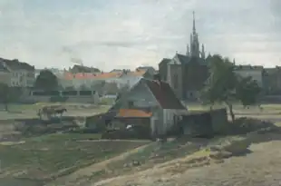Parvis de l'église où se dresse le monument en souvenir de l’homme d'État catholique Charles Woeste.