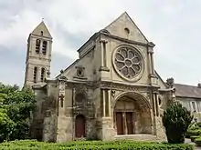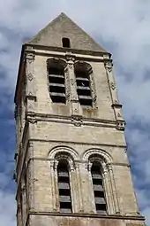 Seule la partie inférieure du clocher est flanquée de contreforts. Le premier étage roman présente à chaque angle une colonne engagée, appareillée comme celles du chevet, mais dotée d'un chapiteau de grands feuillages. Les deux baies abat-son par face, cantonnées de colonnes aux chapiteaux du même type, s'inscrivent dans des archivoltes également cantonnés de colonnes. Le second étage Renaissance est d'un diamètre légèrement plus important et ajouré de deux baies abat-son en cintre surbaissé par face. Leurs ébrasements sont pourvus d'une ornementation de motifs végétaux, et les murs sont décorés de pilastres également richement sculptés. Quant aux façades latérales de l'église, elles sont très sobres et consolidés par des contreforts verticaux recouverts de chaperons, provenant des remaniements du XIXe siècle tout comme les baies plein cintre des bas-côtés. Les murs gouttereaux de la nef dépassent les toits en appentis des bas-côtés en hauteur, mais pas assez pour laisser place à des fenêtres hautes. La première travée de la nef a été ajoutée pendant la première moitié du XVIe siècle et est encore plus élevé[7].
