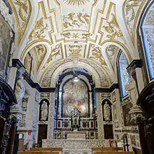 • Les murs des nefs latérales sont lambrissés jusqu’à une hauteur de 4 mètres. Toute une série de médaillons sculptés dans le bois racontent en 40 scènes, d’un côté la vie de Saint-Ignace, et de l’autre des scènes de la vie de Saint François Xavier.