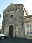 La façade occidentale est surmontée d’un fronton triangulaire. Une corniche qui relie deux contreforts plats est soutenue par des modillons représentant des têtes d‘hommes, les uns barbus, les autres imberbes. Le portail central à simple rouleau dont l'arc est orné d'un cordon à billettes présente au-dessus de son extrados un haut-relief sculpté très endommagé qui pourrait être un agneau romain en réemploi. Ce portail est encadré par deux arcades aveugles et surmonté d'un oculus[8]. Cette façade est à division verticale et division horizontale, ce qui est rare (2,6 %) dans les églises romanes de l'Angoumois [10]