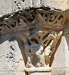 La série modillonnaire, qui soutiennent la corniche à billettes, compte quatre sujets animaliers et trois sujets à figure humaine. Ils sont très bien conservés, sauf un qui a été furieusement martelé au XIXe siècle, sans doute par un curé pudibond.