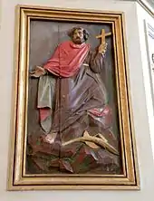 - Le groupe sculpté représentant saint Roch de Montpellier avec l'ange qui lui apporta son pain et l'ange qui soignait ses plaies infligées par la peste, est en pierre calcaire. C'est une œuvre de qualité qui date de la même époque que le Christ, et a été offerte par les habitants pour montrer leur gratitude pour que leur village ait été préservé de la peste[9]. La sculpture n'est pas encore classée à ce jour.