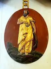 Parmi le mobilier de l'église, six éléments sont classés monument historique au titre objet[15]. Quelques autres éléments méritent également l'attention, dont notamment les représentations des deux saints patrons, pour leur dimension symbolique.