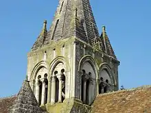 L'étage de beffroi présente sur chaque face deux fenêtres en tiers-point géminées, qui sont séparées par une colonnette appareillée destinée à recevoir, avec deux colonnettes analogues à gauche et à droite, les doubles archivoltes toriques. Comme à Orrouy et Saint-Vaast, chaque baie est recoupée en deux étroites baies, cette fois-ci en plein cintre, et surmontées d'un tympan nu qui repose à son tour sur trois colonnettes. Celle du milieu est libre, raison pour laquelle l'architecte a opté pour une colonnette monolithique. Une partie des tympans et colonnettes a été reconstituée lors d'une restauration assez récente, et les abat-son incompatibles avec les clochers romans ont été retirés côté sud et est. Les minces colonnettes qui ornent les quatre angle de l'étage ont également dû être refaites en partie. La corniche de palmettes est remarquable, mais en partie très érodée ou manquante. Sur chaque face, il y avait initialement dix palmettes groupées deux par deux, disposées entre des têtes grimaçantes. La flèche octogonale en pierre est plus courte que la plupart de ses homologues, et atteint une hauteur de 25 m au-dessus du sol à son sommet. Quatre faces sont percées de deux étroites ouvertures rectangulaires superposées, et de petits oculi rond existent en haut de chaque face. Les pierres de parement comportent en partie un décor de lignes gravées en zigzag. Les quatre angles sont occupées par des pyramidons sur plan carré[24],[27],[26],[23].