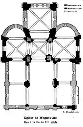 Au cours des années 1130-1140[11], l'église est en grande partie reconstruite, et en même temps, agrandie. La base du clocher est voûtée d'ogives, les piles et arcades sont reprises, et un second étage de baies est ajouté. Les croisillons et le chœur de l'église primitive sont démolis, et remplacés par des croisillons plus élevés, et un chœur plus large : ce sont ceux que l'on voit actuellement. Ils sont voûtés d'ogives dès le départ. La largeur du chœur roman était commandée par la distance entre les piles du clocher, alors que le chœur actuel s'évase dans sa partie antérieure, avant d'atteindre sa largeur définitive. La partie antérieure forme comme une sorte de demi-travée voûtée en berceau, et de telles travées existent également à l'est des croisillons. Ce sont les vestiges de deux absidioles, que l'on édifia en même temps que le nouveau chœur et les nouveaux croisillons. Elles devaient être en hémicycle et voûtées en cul-de-four, peu profondes, sans communication avec le chœur. La coexistence d'un chœur carré au chevet plat et d'absidioles en cul-de-four, issus d'une même campagne de construction, est très rare. Marcel Aubert n'a trouvé d'autres exemples qu'en Allemagne, mais il y a aussi l'état de l'église de Foulangues pendant la seconde moitié du XIIe siècle, et Dominique Vermand suppose que les parties orientales soient inspirées du plan du chevet de l'église du prieuré Saint-Jean-du-Vivier, commune de Mouy. À Saint-Jean-du-Vivier, une abside toujours en hémicycle est flanquée de deux absidioles. C'est l'introduction du voûtement d'ogives qui aurait favorisée l'adoption du chevet plat, car dans le premier temps du voûtement d'ogives, l'on ne sut faire que des voûtes rectangulaires. L'église de Mogneville fait partie d'un groupe d'une quarantaine d'églises dans l'Oise, qui possèdent des voûtes d'ogives romanes, antérieures à 1150. Dominique Vermand a identifié de nombreuses analogies stylistiques avec les églises voisines de Bury, Cambronne-lès-Clermont, Foulangues et Ully-Saint-Georges, qui donnent à penser que les voûtes de ces églises ont été construites par le même atelier[12],[13].