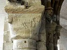 Chapiteaux gothiques et romans du pilier sud-ouest, et cul-de-lampe du XVe s.