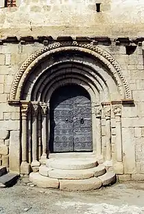 Ce portail est encadré de trois paires de colonnes surmontées de chapiteaux sculptés de motifs zoomorphes. Ce portail est surmonté d'une archivolte à quatre voussures. L'archivolte est ornée de trois arcs toriques (boudins). L'arc torique externe est orné de boules et surmonté d'une frise en damier.