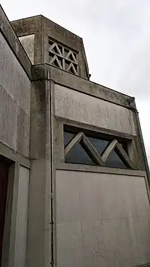 Le revêtement des façades fut réalisé avec des dalles en pierre de Comblanchien, fixées par des agrafes en cuivre au voile en béton. Les terrasses à trois niveaux sont séparées par des claustras géométriques. Le clocher s'ouvre sur un porche d'entrée tandis que, dans sa partie supérieure, les abat-sons sont en dalles de béton horizontales, surmontés d'une horloge et d'un lanternon[1].