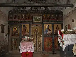 À l'intérieur, les murs sont ornés de fresques qui ne subsistent qu'à l'état de fragments ; parmi les scènes représentées figurent l'Annonciation (mur est) et la Communion des Apôtres sous les espèces du pain et du vin (abside) ; sur le mur sud figurent la Nativité du Christ, le Baptême du Christ et la Résurrection de Lazare et sur le mur ouest la Dormition de la Mère de Dieu. Le cycle des Grandes fêtes liturgiques était séparé des figures en pied par une frise de médaillons avec des bustes de saints. Selon leurs caractéristiques stylistiques et iconographiques, les fresques conservées datent des premières décennies du XVIIe siècle, lorsque l'église a probablement été peinte pour la première fois[4].