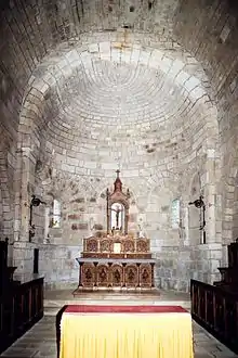 L'abside est voûtée en cul-de-four et est ornée d'une série de cinq arcades, deux aveugles et trois ajourées, tandis que la nef est voûtée en berceau plein-cintre.