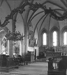 Le portail du XVe siècle, précédé d'un porche dont la voûte repose sur des culots sculptés aux symboles des évangélistes, donne dans une nef unique à voûte en berceau brisé, entièrement reconstruite au XVIIIe siècle. L'intérieur est rythmé par les quatre travées marquées par des arcs doubleaux et par les ouvertures encadrées par des arcs surbaissés reposant sur des piliers cruciformes engagés. Il existe également deux chapelles latérales de profondeur différentes, qui dateraient de 1645[1].