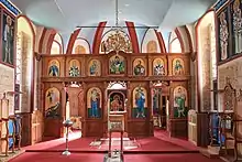 L'iconostase a été sculptée dans la seconde moitié du XVIIIe siècle dans un style rococo ; mais son auteur est inconnu ; on y trouve des grappes de raisin, des feuilles de chêne, des boutons de rose et des volutes qui encadrent les icônes ; après la Seconde Guerre mondiale, elle a été endommagée par un incendie et certaines icônes ont été transférées au Musée d'art religieux de Sremska Mitrovica. Ces peintures, autrefois attribuées à Mojsej Subotić, seraient en fait l'œuvre de Jovan Isajlović Stariji[1].